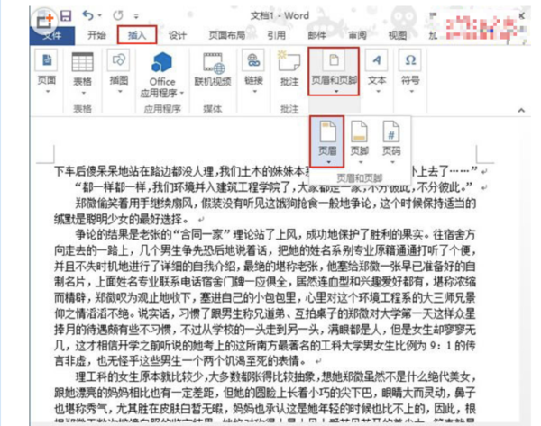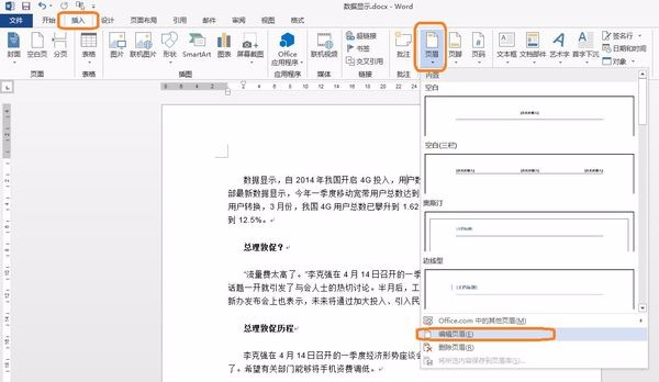1.在word2013中,插入---页眉----编辑页眉,如下图: