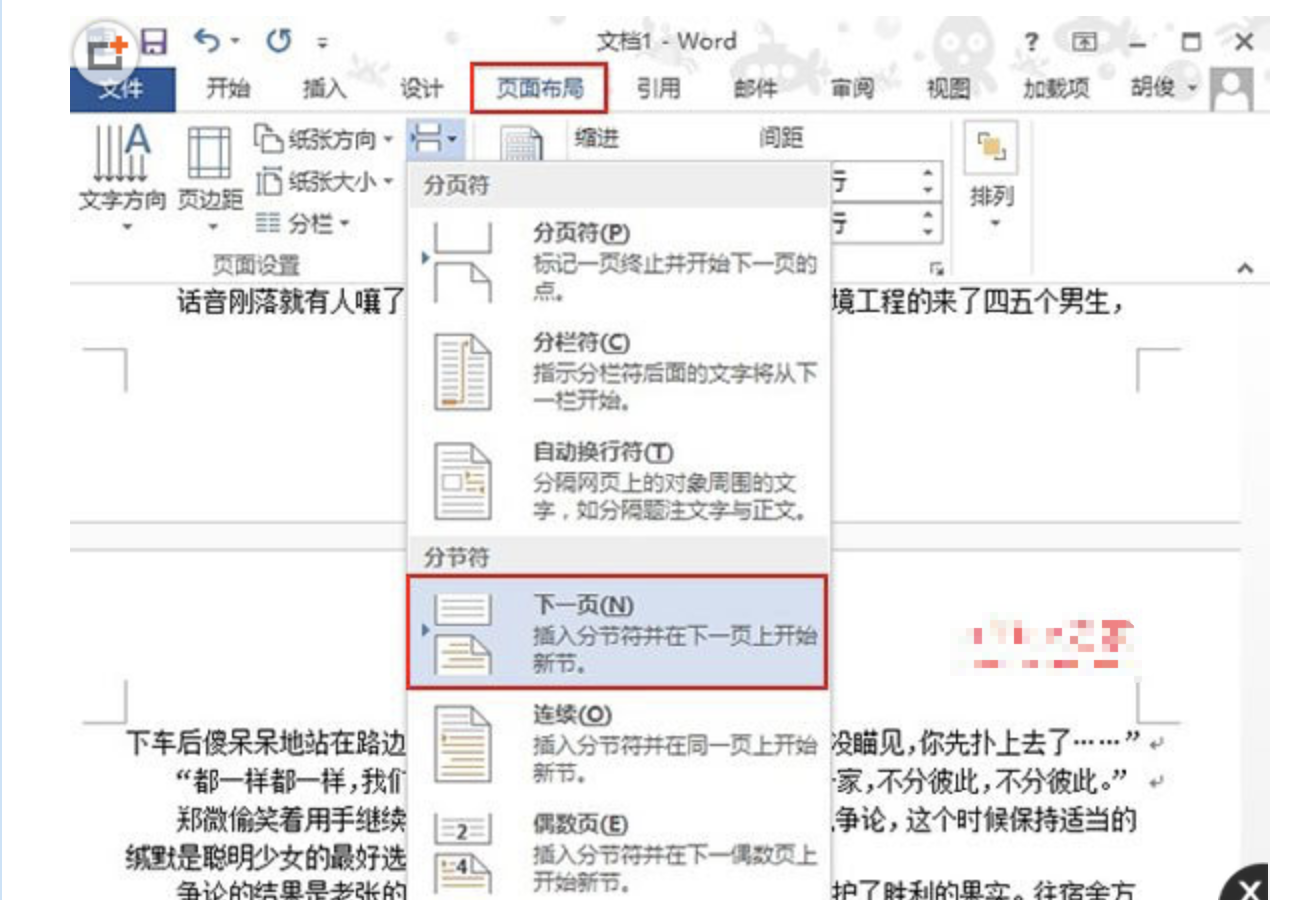 ①启动Word2013,光标定位到需要插入页眉的那一页页首,然后点击菜单栏--页面布局--下一页。