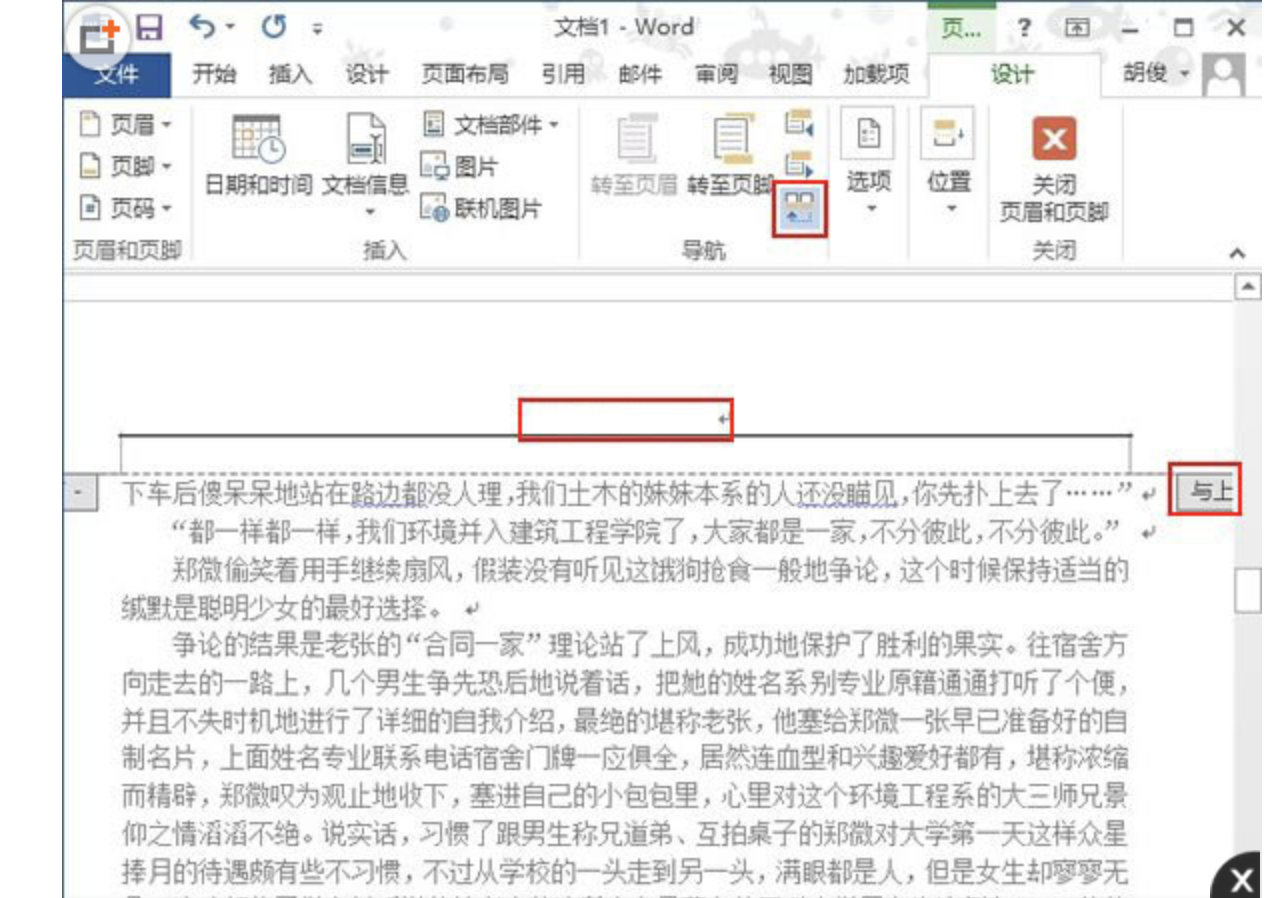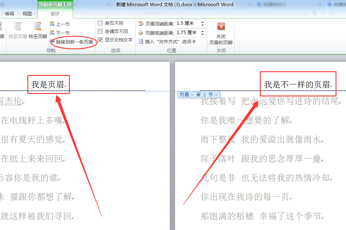 ③下面是关键的一步,我尽量描述详细点。先点击设计选项卡下的链接到前一节按钮,这时右侧红色方框内容会消失,然后在此页的下一页同样点击取消链接到同前节,返回到之前的那一页输入页眉。