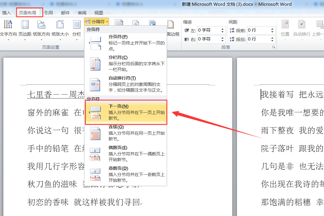 1、光标移到第二页的最后一个字后面,然后依次点击“页面布局”----“分隔符”---“下一页”