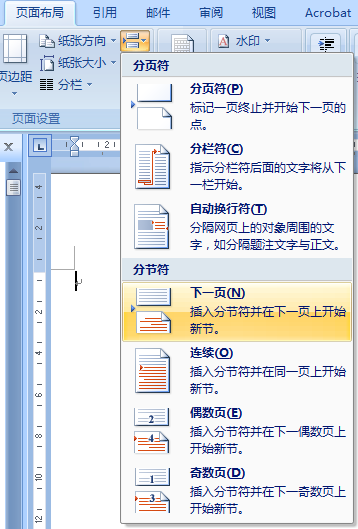 3、光标停在需单独设置页眉的下一页首行首位置,点击“分隔符”中的分节符“下一页”。