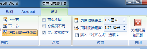 或者双击页眉页脚位置,即可编辑此时可以输入所需要的页眉或页脚内容;若当前为整个文档的第二节(或更高,如第三节等),在出现的“设计”菜单中的导航区域,取消“链接到前一条页眉”(再点一次,取消选中状态;缺省为选中),如下图所示: