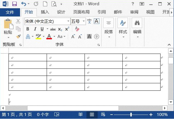 1、在Word文档中插入一个5行4列的表格,在其下方至少保留两个回车符,如下图所示。