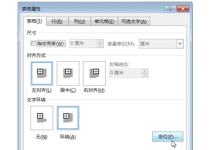 5、打开【表格属性】对话框,切换到【表格】选项卡;然后单击【定位】按钮,如下图所示。
