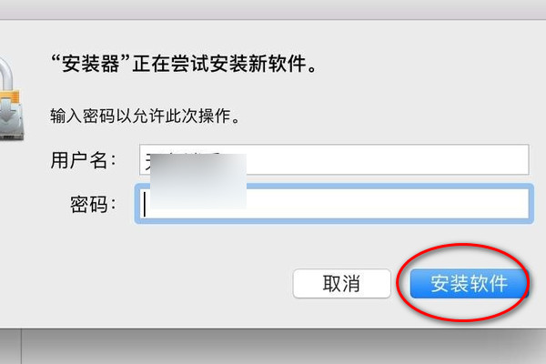 4、之后,根据界面的提示输入苹果笔记本的管理员的用户名和密码,并点击安装软件按钮。