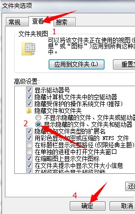 2、其打开的窗口如下图,在查看选项中找到“显示隐藏的文件,文件夹和驱动器”, 选中它,再单击应用和确定即可,这是所有的隐藏文件会被显示出来。