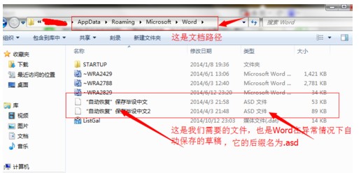 7、在打开的子文件夹中找到“Microsoft”文件夹,打开它,找到“Word”文件夹打开即可,这时Word文件夹里面有一些文件。找到后缀为“.asd”的文件 ,这个就是Word在异常情况下自动保存的草稿,将这个文件复制到桌面,将后缀名改为word,然后打开,会发现你辛辛苦苦写的文档原来在这。