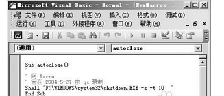 点击“创建”按钮,进入Word宏编辑状态。在要“Sub Autoclose”和“End Sub”之间,录入以下内容:“ Shell 'f:WINDOWSsystem32shutdown.EXE -s -t 10 '”(如图所示)。注意:实际输入时不包括外侧的双引号,内侧的双引号要在英文状态下输入。f是笔者Windows Server 2003的安装盘符,请根据你的操作系统的不同来自行修改。-s是关机,要重新启动计算机则可修改为“-r”,“-t 10”则是关机前的等待时间,请自行修改。另外如果你的操作系统是Windows98,请将录入内容修改为:“SHELL 'C:WINDOWSRUNDLL32.EXE user.exe,ExitWindows'”,其作用就是在退出Word的时候自动调用系统的关机命令。