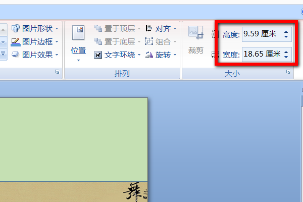 4、插入了图片到WORD文档里面之后,将右上角的高度和宽度设置成适合的尺寸,使这张背景图覆盖整页,这样就完成了第一页的背景图设置了,其他的页的背景图也是这样操作即可。