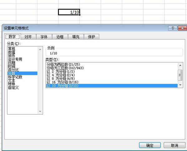选中区域——右击——设置单元格格式——弹框数字分类中选择分数——类型以10为分母——在选中区域输入1/10,如图: