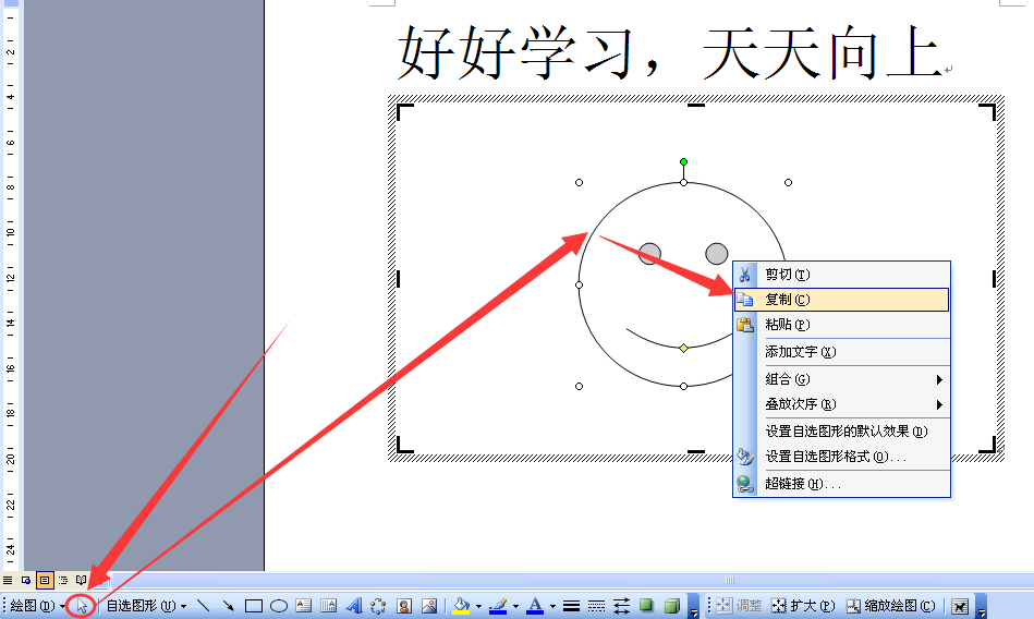 (3)旋转:选中要旋转对象,然后在“绘图”中的“旋转或翻转”中选择“自由旋转”图标按钮,把鼠标移动到一个绿色的小点上,鼠标则会变成一环型箭头指针,按住鼠标左键,再拖动鼠标使对象绕其中心旋转即可;若需以15°为角度改变单位旋转,可在牵引同时按住“Shift”键。