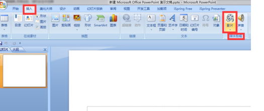 1.打开PPT,新建幻灯片,然后在菜单栏找到“插入”-“影片”。