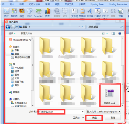 2.弹出窗口,找到需要插入的影片,这里是桌面上的“未命名.mp4",点击确定。