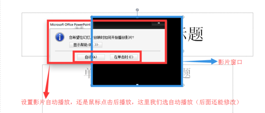 3.影片插入到了幻灯片中,蓝色框框里面的就是影片,而弹出的红色框框里面的,是设置视频自动播放,还是鼠标点击后播放。这里我们选自动播放,当然在后面还可以进行修改设置。