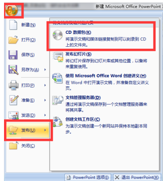 5.进行各项设置后(就不设置了,每个人根据需求调整大小,播放设置等)。对PPT进行打包,这样在别的电脑上就能播放了。点击左上角的OFFICE按钮,找到”发布“-”CD数据包“,点击。