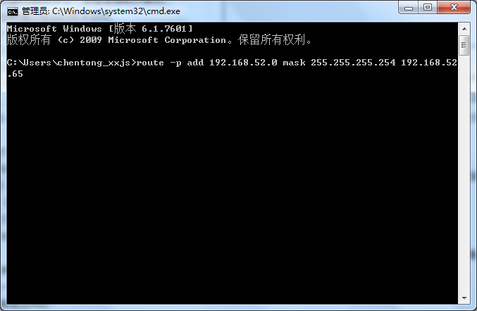 4.输入命令 route -p add 192.168.52.0 mask 255.255.255.254 192.168.52.65 点击回车。这时我们就添加了静态路由,功能是在本机访问192.168.52.*/255.255.255.254网络时,全部通过192.168.52.65的网关来访问,这个网关在本机就是B网卡。