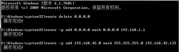 第三步:route -p add 192.168.42.0 mask 255.255.255.0 192.168.42.132 ::添加192.168.42.0网段路由为192.168.42.132内网路由,可以根据需要调整ip段和子网掩码太到多网段内网路由的效果。