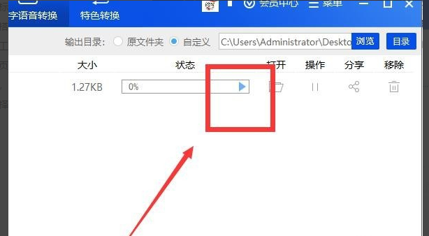 4、上述参数都设置完成后,就可以开始真正文字转语音的操作了,点击页面上方状态栏下方的【播放】三角形按钮。转换过程中必须保持优质的网络状态,网络状态差会直接导致文件转换中断失败。如下图所示。