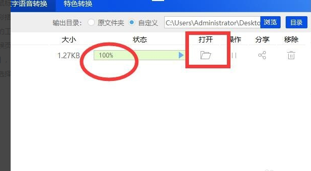 5、请等待几分钟,等待文件转换进度度显示为100%的时候,就表示文件已经转换完成了。可以直接在页面中找到【打开】按钮,点击,可以查看和保存刚刚转换的文件,也可以在上一部的设置保存自定义文件夹中查看文件。如下图所示。