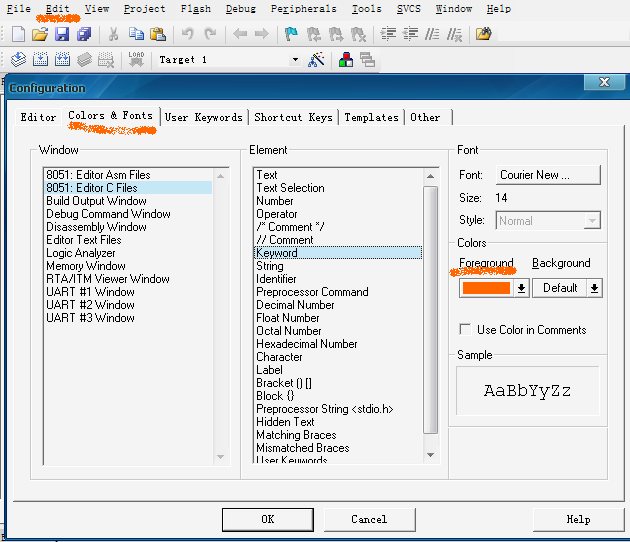 如果你想自己改变颜色,那么就点击菜单上的Edit——configuration选项——Colors&Fonts——再点EditCFile——找到Keyword,在右边Foreground下拉按钮选择你所想要的颜色,最后OK!