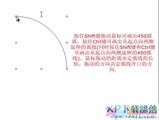 8. 画弧。绘图工具栏——自选图形——基本形状——选用“画弧”工具,按住Shift键拖动鼠标可画出450圆弧,按住Ctrl键可画出从起点向两侧延伸的弧线(同时按住Shift键和Ctrl键可画出从起点向两侧延伸的450弧线)。鼠标拖动的距离决定弧线的长短,拖动的方向决定弧线开口的方向.