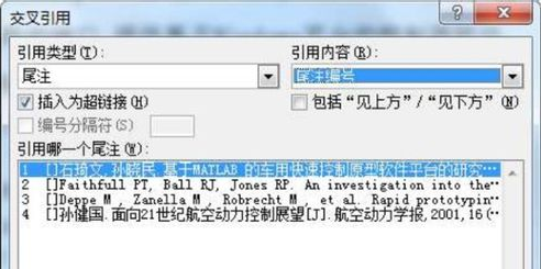 不要以为已经搞定了,我们离成功还差一步。论文格式要求参考文献在正文之后,参考文献后还有发表论文情况说明、附录和致谢,而Word的尾注要么在文档的结尾,要么在“节”的结尾,这两种都不符合我们的要求。 解决的方法似乎有点笨拙。首先删除尾注文本中所有的编号(我们不需要它,因为它的格式不对),然后选中所有尾注文本(参考文献说明文本),点“插入|书签”,命名为“参考文献文本”,添加到书签中。这样就把所有的参考文献文本做成了书签。在正文后新建一页,标题为“参考文献”,并设置好格式。光标移到标题下,选“插入|交叉引用”,“引用类型”为“书签”,点“参考文献文本”后插入,这样就把参考文献文本复制了一份。选中刚刚插入的文本,按格式要求修改字体字号等,并用项目编号进行自动编号。