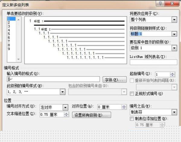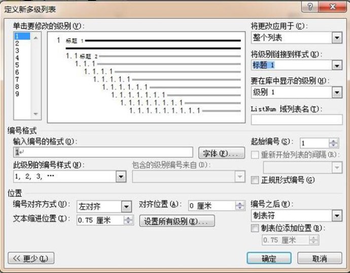 3、点击"开始"/多级列表图标()/定义新的多级列表,在出现的定义界面中,点击左下角的"更多>>",可以看到右边的选项"将级别链接到样式",默认是"无样式",按照级别,把一级列表链接到标题一,二级列表链接到标题二,依此类推。点击确定退出