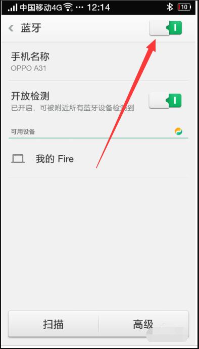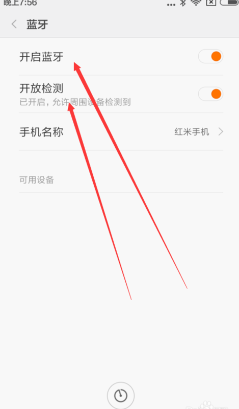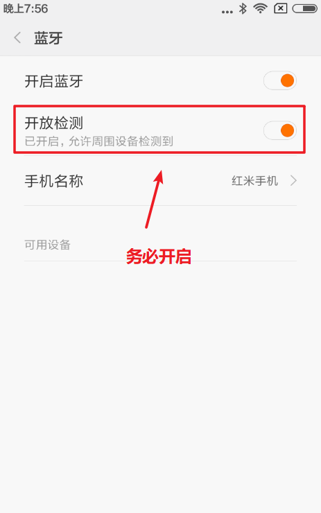 3.在【蓝牙】管理页面,将蓝牙功能开启后,务必开启【开放检测】功能,否则另一部手机无法接收到本手机的蓝牙信号。