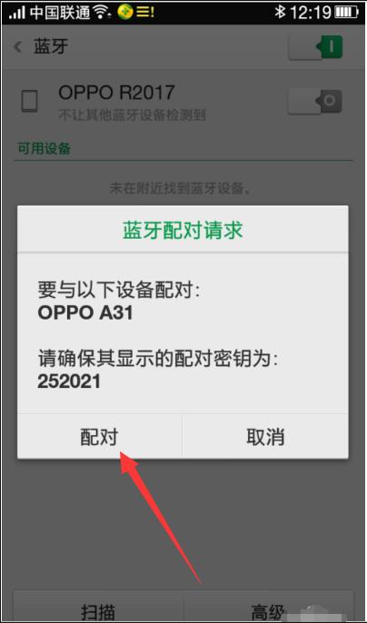 3、点击设备后,自己的手机和对方的手机都会弹出蓝牙确认框,输入相同的密匙,两个设备都点击“配对”,即可配对成功。