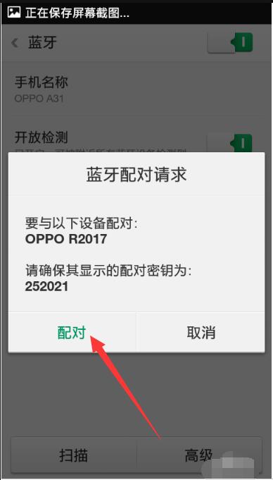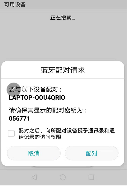 3、点击设备后,自己的手机和对方的手机都会弹出蓝牙确认框,确认两个设备的“密钥”号码相同时,两个设备都点击“配对”。