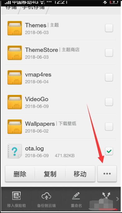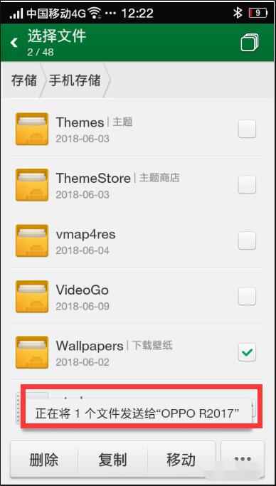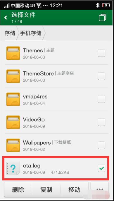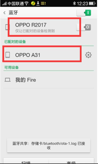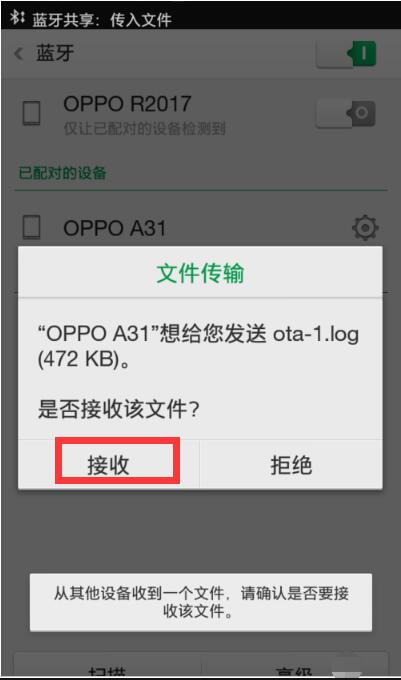 7、然后在a31手机上选择ota.log文件,把主内存中的这个文件发送到r2017手机上。