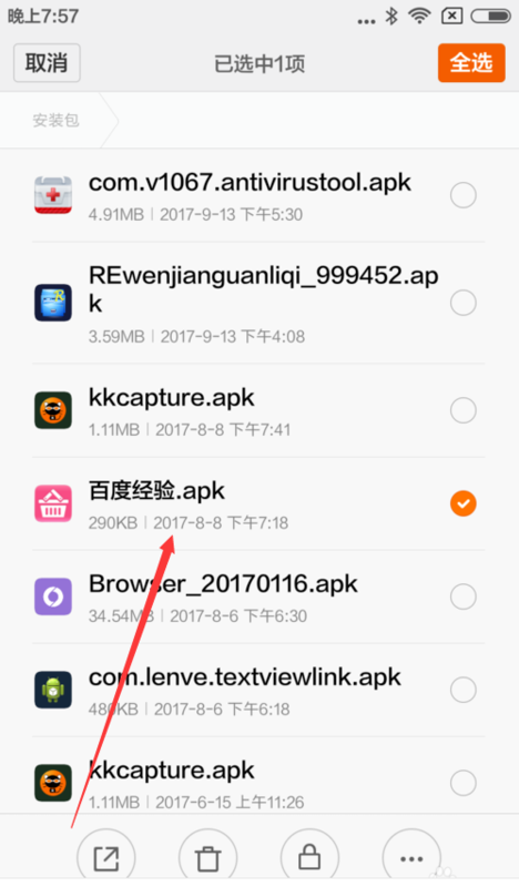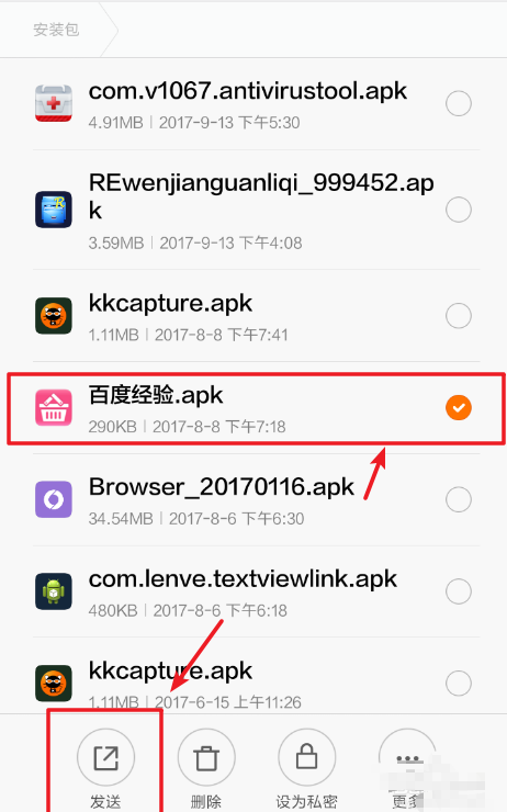 5、然后找到要发送的应用或文件,长按出现发送,如下图所示。