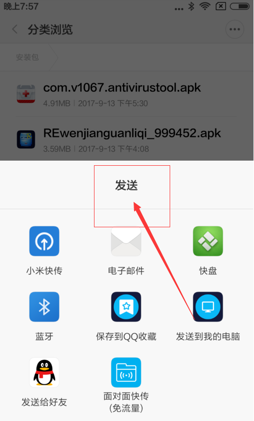 8、选中文件点击右下方“...”工具栏,选择跳出来的“发送”功能项,如下图:
