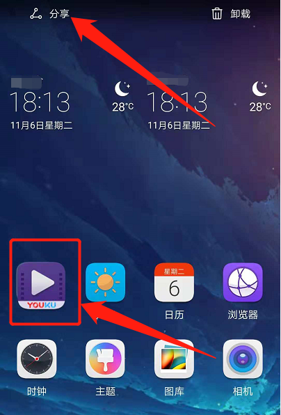 5、在桌面中长按你需要传输的软件,会显示“分享”按钮,把软件拖到“分享”按钮的区域后松手。