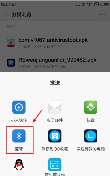 5.点击发送后,会弹出发送方式的选择,选择【蓝牙】,即可使用蓝牙传送该应用给其他蓝牙设备。