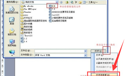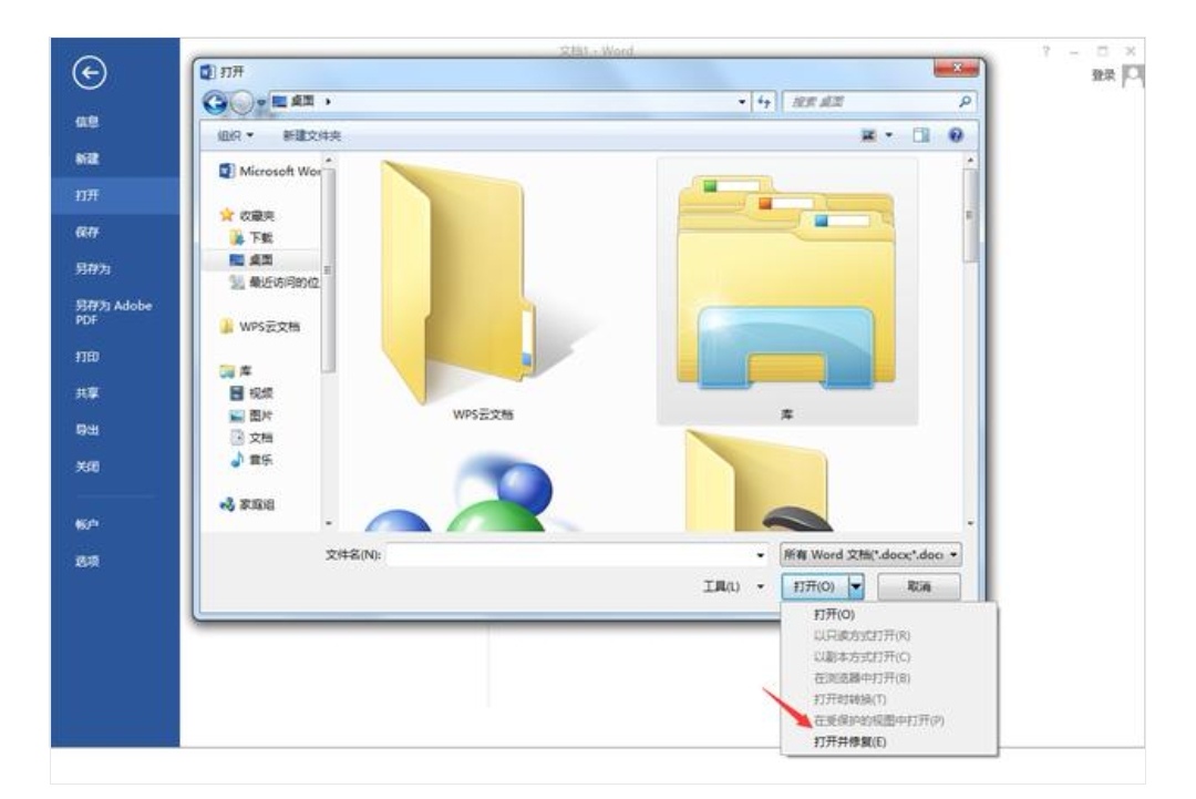 如图示,在WORD打开对话框中选打开并修复功能。