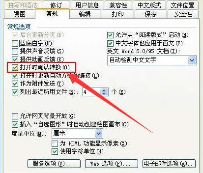 1、打开Word,打开任意一个未损坏的Word文档,然后点击【工具】菜单-【选项】-【常规】,选中“打开时确认转换”。