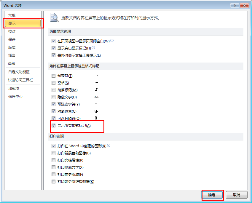 2.显示分隔符的方法:在word左上角点击开始菜单,点击选中右下角的word选项。在弹出的word选项窗口中,单击显示标签,单击选中显示所有段落标记复选框,确定退出。如图所示。