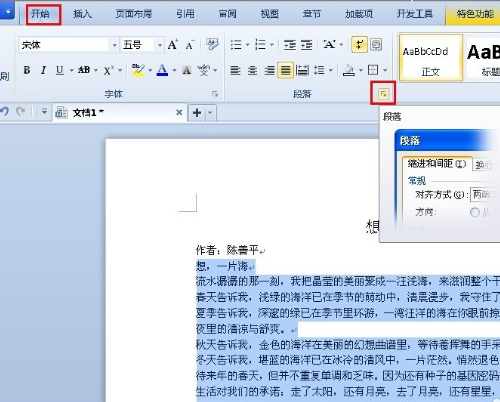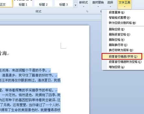 2、然后选中文字,在菜单栏中选择开始菜单下的【段落】中的缩进或间距,进行首行缩进。