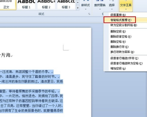 5、选中要设置的文字,在菜单栏【开始】选项中,选择【智能格式整理】点击设置。