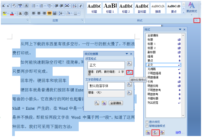 1、选中文字,单击“更改样式”右下的小箭头,在样式对话框中,点击“样式查看器”,“清除段落格式”。