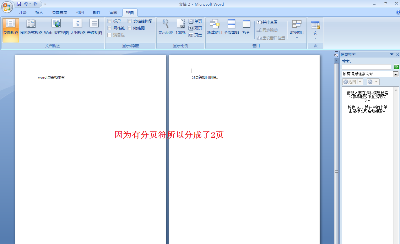 因为有分页符所以是两页,点击普通视图后