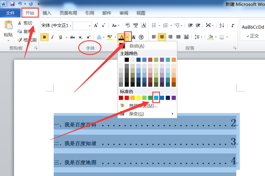 word文档中更改目录的字体颜色,需要选中目录然后再字体设置中做相应的颜色更改。
