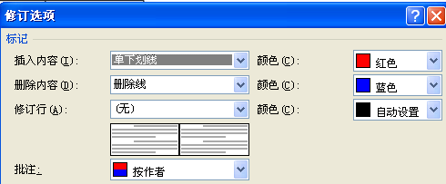 2、弹出修订选项对话框,在插入内容、删除内容后的颜色选项中可以设置所需要的颜色。