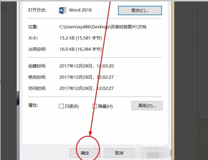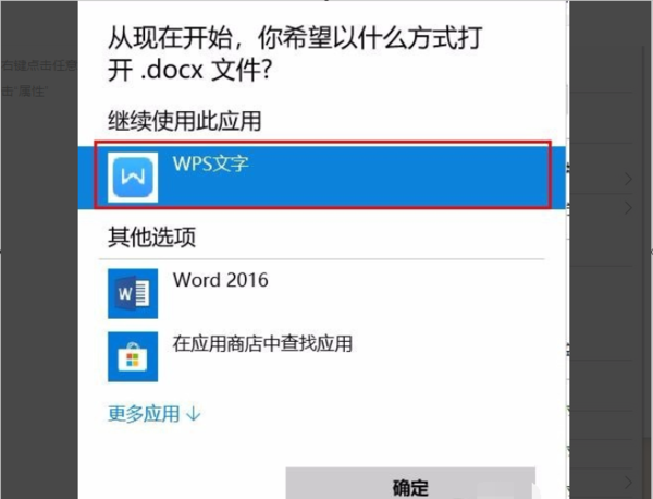 5、返回属性对话框,再次点击“确定”,这样就将文档默认打开方式更改为了“Word2016”