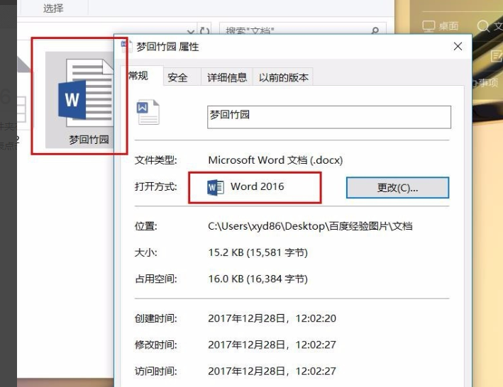 6、更改后在再次查看文档属性,就会发现默认打开文档的方式改为了“Word2016”,双击文档,文档就直接以“Word2016”方式打开