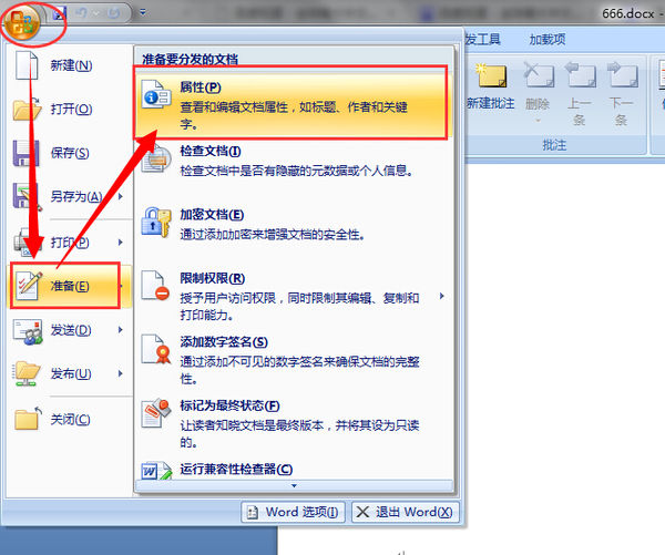 1、打开word文档,点击【开始】,选择【准备】,点击【属性】;