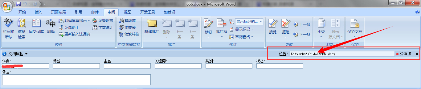 2、在弹出的【文档属性】界面,可以看到word文档的【位置(存放文件夹)】。