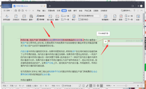 3、接下来选择需要进行标注的内容,然后点击上方工具栏的“插入批注”,在下面红色剪头所指的框内,输入批注内容,就完成了。