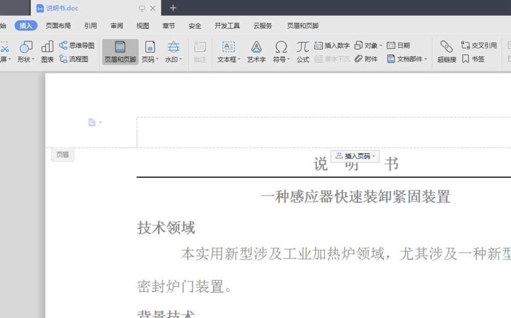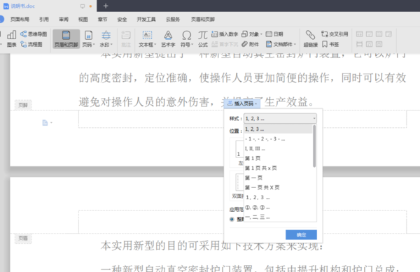 2、光标定位到页面上方的页眉处,会自动提示差入页码选项。